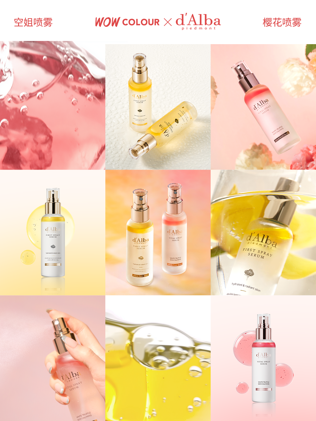 此次入驻,d'Alba 黛尔珀为WOW COLOUR带来了超人气星品空姐喷雾,黄金比例的水油配方能够瞬间赋予肌肤柔润光泽。细腻如雾的质地轻盈包裹肌肤,带来即时水润与长效养护。搭配清新柑橘香气,不仅让干燥肌肤焕发弹润光彩,更能改善角质暗沉,释放健康明亮的肤感。另有专为油性与敏感肌定制的樱花喷雾,兼具清爽补水与维稳呵护双重功效,在舒缓泛红的同时帮助调节水油平衡,玫瑰芬芳更是如春日清风般轻盈,予肌肤透亮质感。