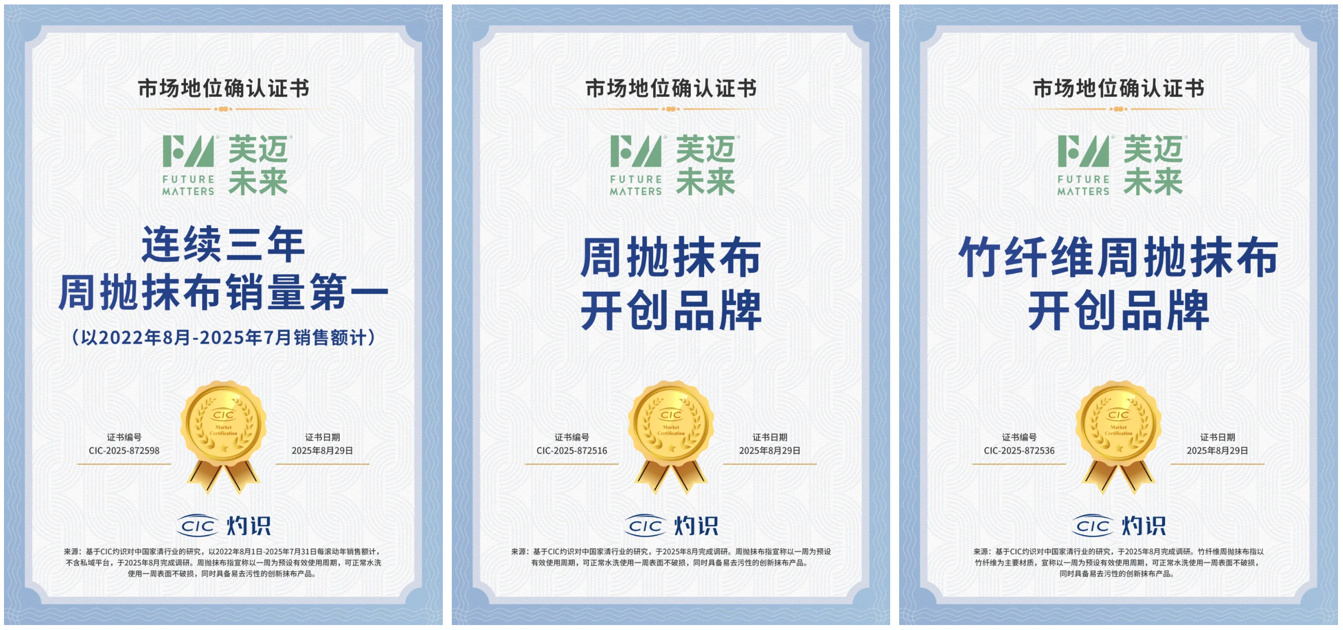 近日,FUTURE MATTERS芙迈未来获得由国际权威咨询机构CIC灼识授予的“连续三年周抛抹布销量第一(以2022年8月-2025年7月销售额计)”、“周抛抹布开创品牌”、“竹纤维周抛抹布开创品牌”市场地位确认证书!