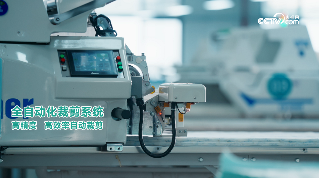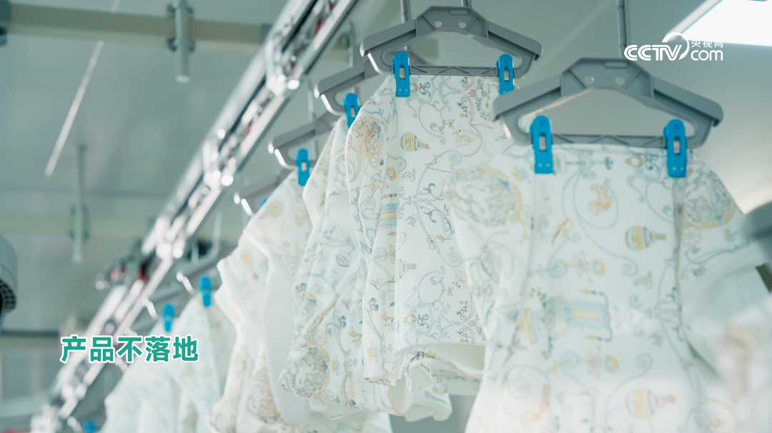 有别于传统服装厂的生产模式,全棉时代使用行业先进的自动化裁剪设备,精准高效完成从牵布到裁剪的一体化作业;全自动生产线如同一条空中走廊,衣物从缝制、打扣、熨烫、整理到包装,全部都在空中行走,依智能系统指令被精准送达各个生产岗位环节,做到“不落地、不入筐”,最大程度减少人手接触,保障产品的洁净度。