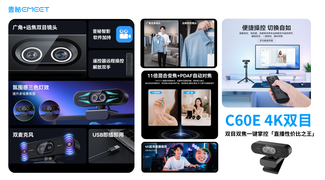 • 核心优势:采用广角+远焦双镜头设计,配备多功能遥控器。一键切换视角让直播控制更加便捷,11倍数字变焦能力满足不同拍摄距离需求。