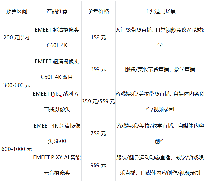 为帮助您快速决策,我们首先通过一张表格对比EMEET壹秘的五款热门电脑直播摄像头产品: