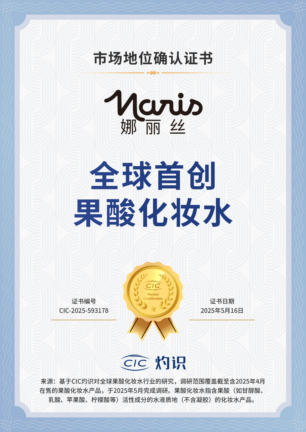 在2025年5月期间,CIC灼识采用科学、严谨的统计与分析方法,对全球果酸化妆水行业开展了深度调研和专项的系统性研究。基于对全球果酸化妆水行业竞争格局、产品类型、产品功能等方面的详尽调研与深度分析,CIC灼识确认娜丽丝“全球首创果酸化妆水”的市场地位。