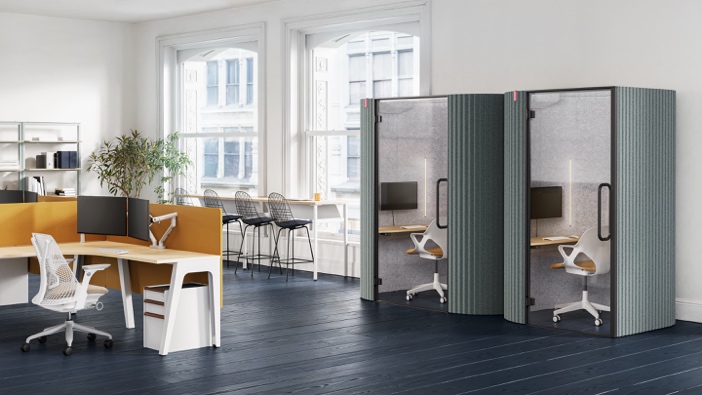 在空间配置上,Bay办公舱提供了充足且灵活的个人工作区域,舱内可选配Herman Miller全系列人体工学座椅,可选的显示器挂臂和挂包钩也增加了额外的实用性;在外观方面,从色彩搭配到多种工作台面材质选项都支持个性化定制,让产品能够很好地融入或补充现有的办公环境风格。