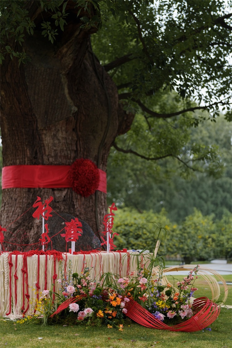 养云安缦2025年婚礼风尚展的序幕于巍峨的香樟树王下缓缓开启。宾客在缠绕着红色祈福绳结的圆(缘)桌旁系下心愿,于光影婆娑中启幕婚典仪式。