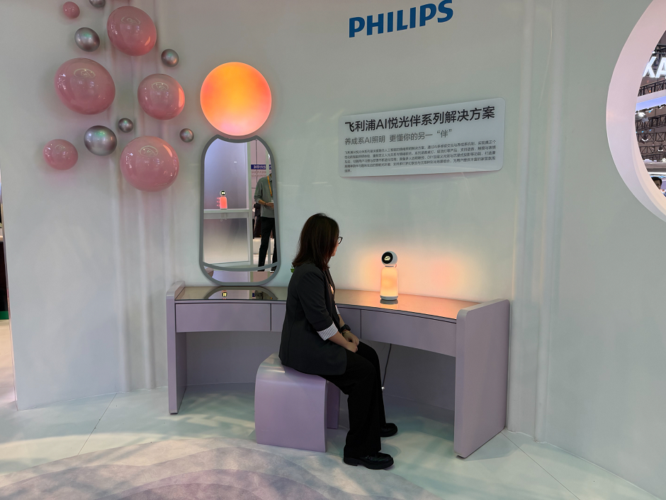 殷慷在采访中表示:“进博会拥有强大的溢出效应,不仅是展示平台,更助力我们的前沿技术加速落地,并为我们链接更广阔的产业生态。”他介绍,此次昕诺飞展出的飞利浦AI悦光伴系列解决方案与飞利浦E9环保吊灯均为全球首发,“这些产品未来将推向全球市场。昕诺飞上海研发中心服务全球业务,我们在专业照明与消费照明领域均取得显著进展,例如在上海研发的氛围照明产品在欧美市场反响热烈,每年均有新品推出。”