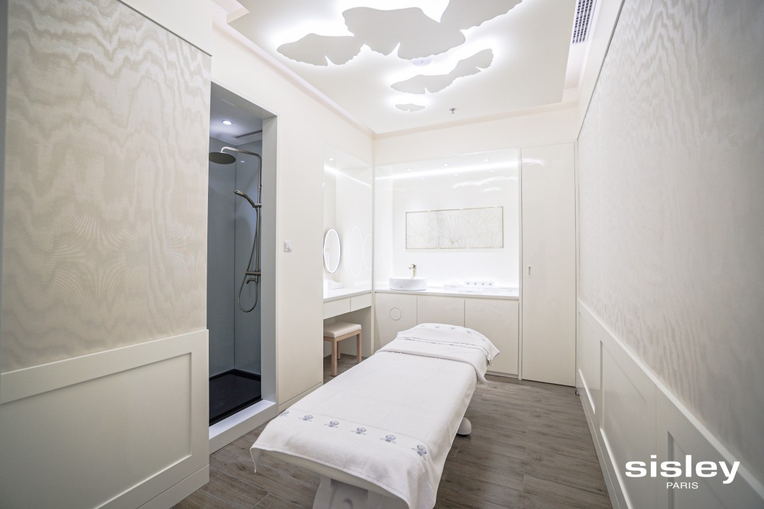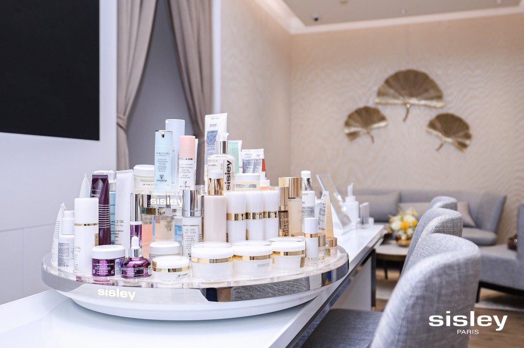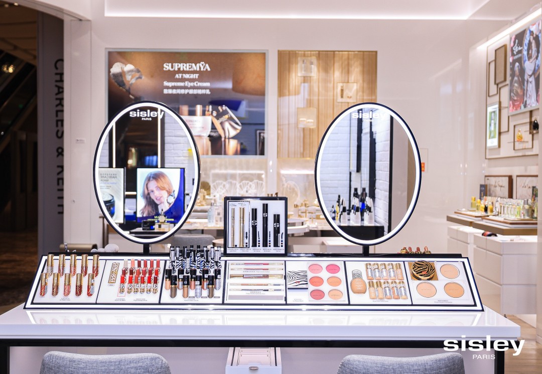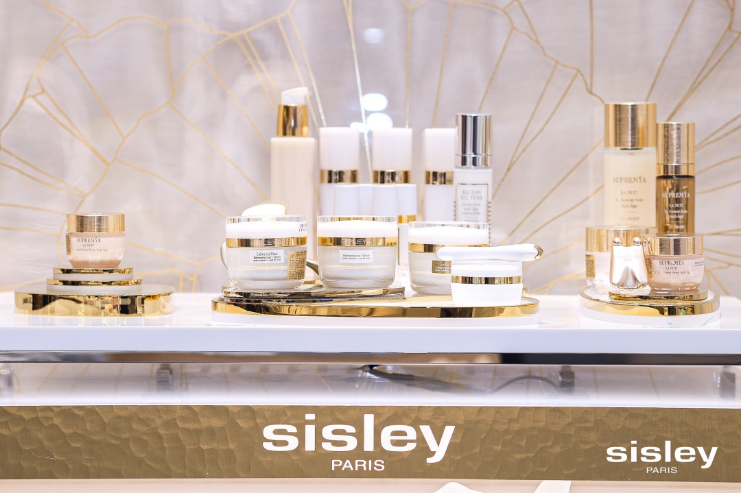 进入店铺,法国希思黎的王牌抗老*(“抗老”在此处指产品抗皱、紧致、保湿等功效)系列——SISLEŸA抗皱修活系列和SUPREMŸA致臻夜间修护系列于左手侧进行独立展出。这个区域的装饰以产品主色调金色为主,金属色框架,闪耀金条纹玻璃,香槟金壁纸……所有的元素烘托出SISLEŸA系列在抗老*(“抗老”在此处指产品抗皱、紧致、保湿等功效)领域的尊贵地位。这个系列凝聚了Sisley法国希思黎尖端的植萃科技,SISLEŸA三大明星产品:“S面霜”抗皱修活臻颜面霜、智能“微囊”技术日间呵护精华乳和夜间修护利器——致臻夜间修护组合,全天候守护您的容颜,为您提供24小时不间断抗老*(“抗老”在此处指产品抗皱、紧致、保湿等功效)方案。更有法国希思黎全新一代SUPREMŸA致臻夜间修护系列,延续了品牌高科技植物精粹理念,结合专研「根源再生复合配方」,以珍稀植萃成分,完成“启动再生——修护御龄——纯净新生”黄金三角,激活夜间再生循环机制,修护日间肌肤损伤,延长内在机体寿命,纯净肌肤,令肌肤由内而外重获年轻光采。