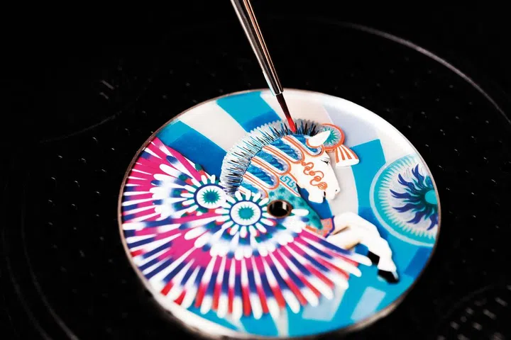 2021年推出的Slim d’ Hermès La Source de Pegase腕表结合微型彩绘、麦秆镶嵌及雕刻工艺