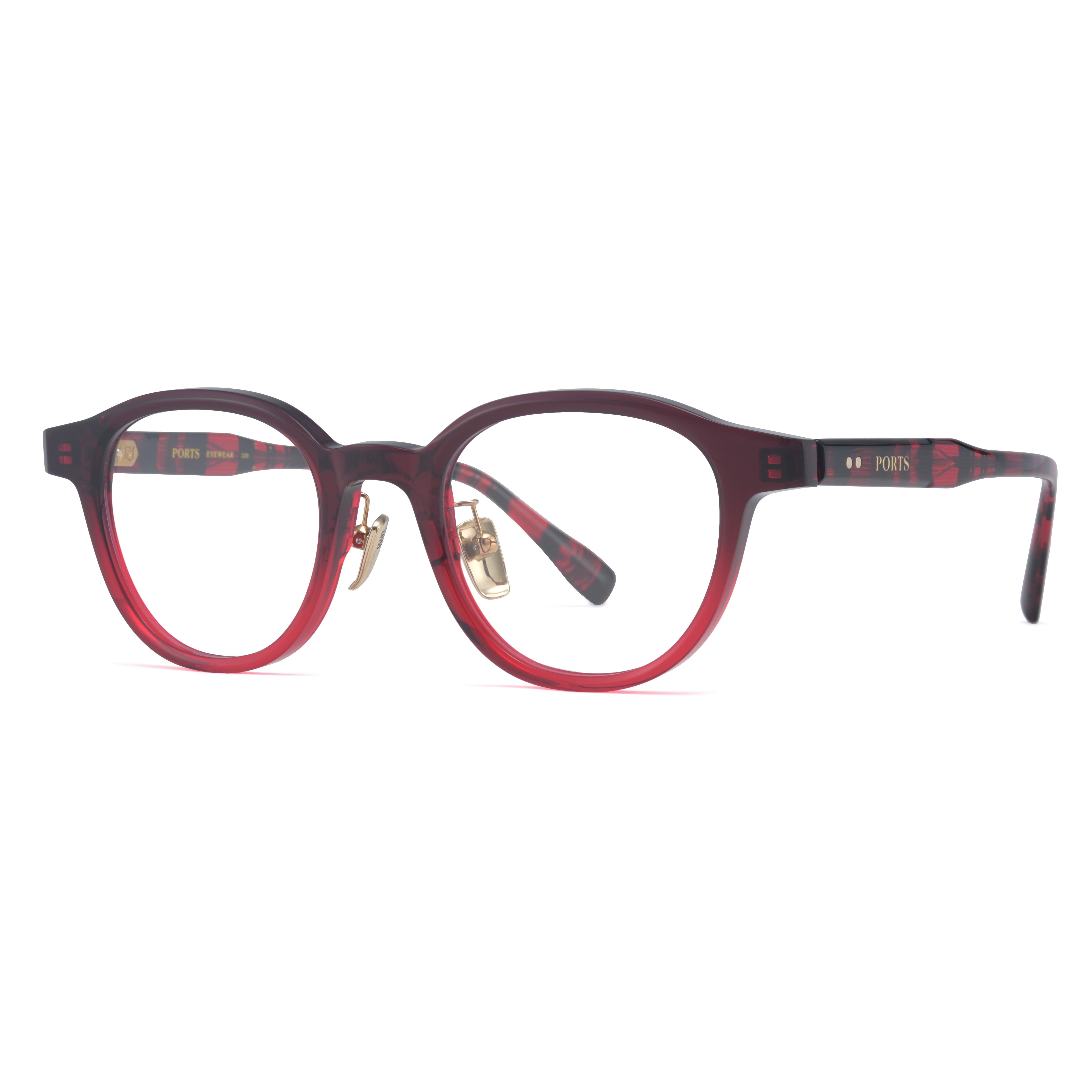 质感高密度板材打造优雅圆框,红色渐变渲染魅力层次,镜腿的复古条纹暗蕴典雅气韵,隐藏式弹性铰链结构精致而简约。