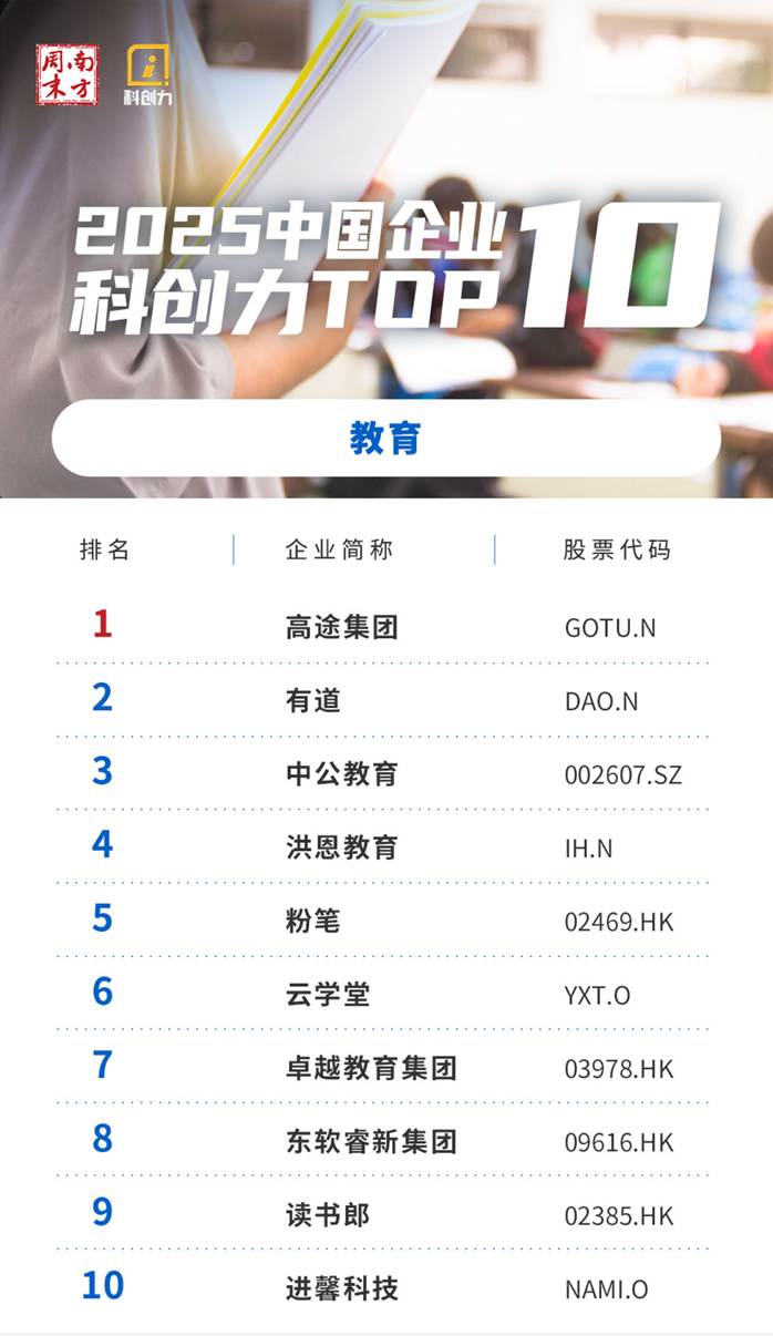 南方周末科创力研究中心建立的“中国企业科创力数据库”,覆盖了国内外资本市场主要上市公司及优质未上市企业,通过研发投入、研发产出、企业发展三个维度近30项指标进行综合评估。在2025年度超过7000家企业的评选中,高途集团以综合评分第一的成绩位列榜首,荣登《南方周末》“2025中国企业科创力教育榜”第一名。