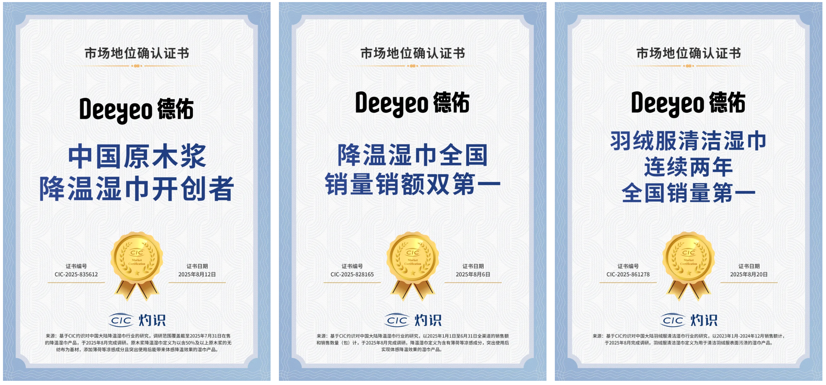 近日,德佑获得由知名权威咨询机构CIC灼识授予的“中国原木浆降温湿巾开创者”、“降温湿巾全国销量销额双第一”和“羽绒服清洁湿巾连续两年全国销量第一”市场地位确认证书!