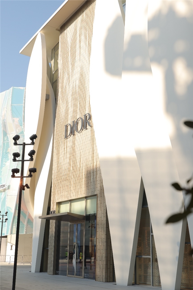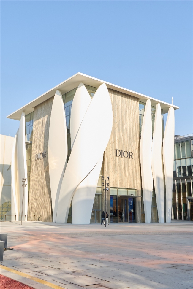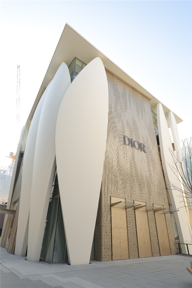 北京迪奥之家于三里屯揭幕,携手普利兹克建筑奖的建筑师,克里斯蒂安德包赞巴克(Christian de Portzamparc),共同构筑这座五层独立建筑。其外立面以十四片流动的金色花瓣构成,设计灵感源自克里斯汀·迪奥先生裁剪高级订制礼服时,白坯布所呈现的灵动线条与自然褶皱——这一经典元素亦贯穿于品牌早期的裙装设计中,如今化作建筑语言,于都市中定格永恒的诗意。这不仅是一座精品店,更是一份对时装与艺术的致敬。