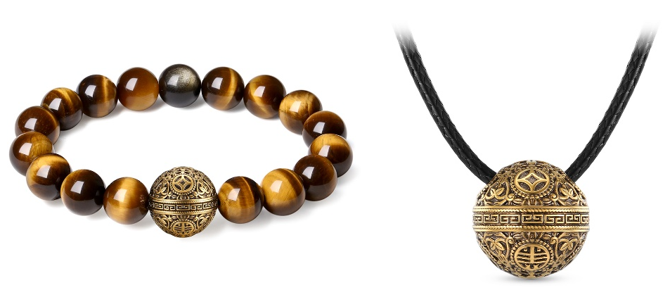“定风珠”主题作品中,虎睛石与黑曜石如夜色凝潭,沉静幽深,黄金通过电黑工艺,淬炼出独特的肌理,如经岁月侵蚀、风雷洗礼,终沉淀出自若神韵。作品亦承载守护与顺遂平安的美好寓意,伴人在纷繁世相中持守本真、步履从容。