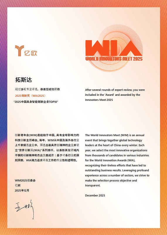 12 月 3 日,在亿欧主办的 “WIM2025 创新者年会” 颁奖盛典上,拓斯达科技凭借在具身智能领域的技术沉淀、场景落地能力及产业赋能成果,成功入选《2025 中国具身智能创新企业 TOP10》,与行业优质企业共同跻身赛道前列,彰显了其在国内人形机器人领域的核心竞争力。本届年会以 “New Growth,New Arena” 为主题,聚焦 AI 引领下的产业新增长,吸引 2000 余位行业从业者共同探讨未来产业的创新趋势与发展路径。