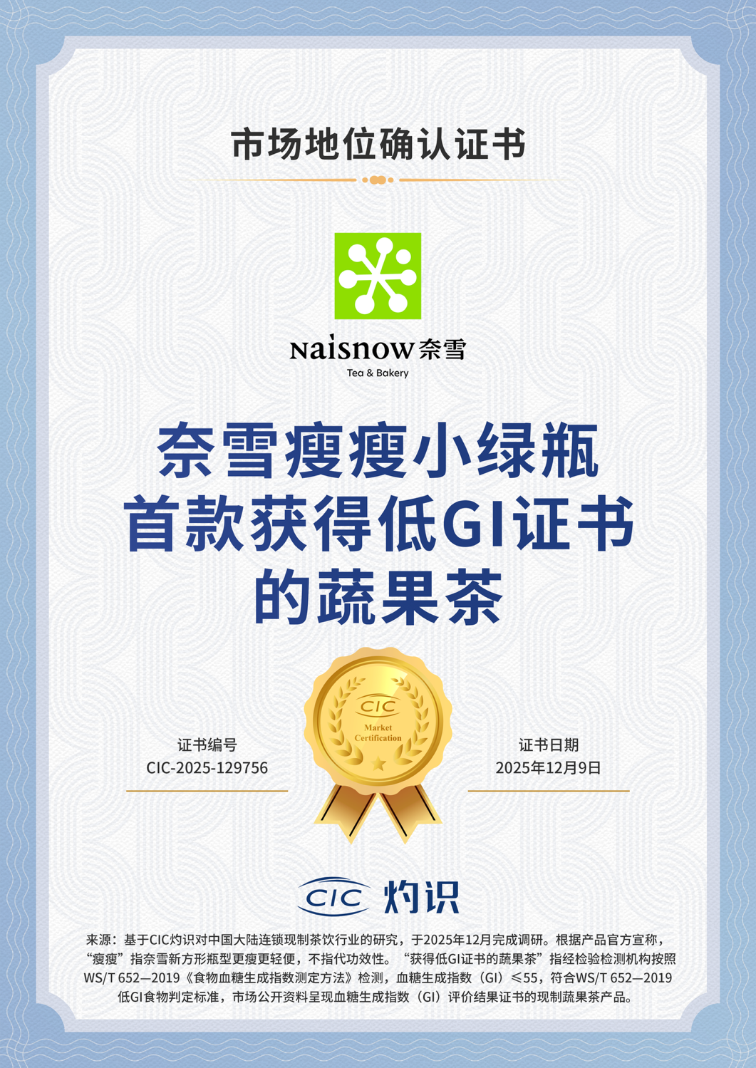 奈雪的茶取得CIC灼识“奈雪瘦瘦小绿瓶,首款获得低GI证书的蔬果茶”的市场地位声明
