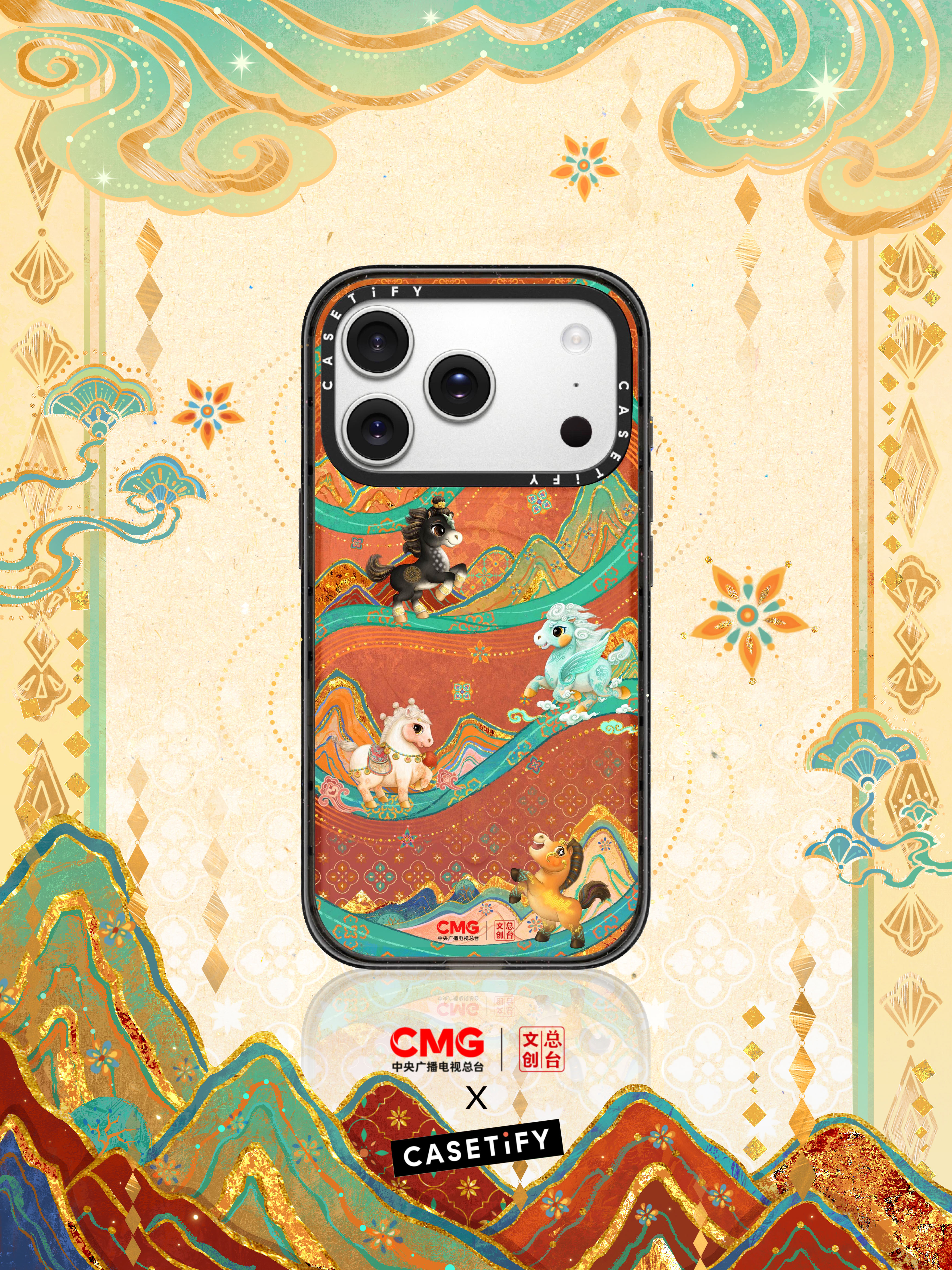 值得一提的是,CASETiFY 获任 2026 年总台“大春晚季”官方版权文创合作伙伴,携手总台文创推出马年春晚主题手机壳产品。围绕春晚吉祥物展开创作,将四匹憨态可掬的吉祥小马“骐骥驰骋”定格在飘逸灵动的敦煌山水间,让新春祝福随线条流转、升腾。这一合作不仅展现 CASETiFY 深耕中国文化的持续探索,也以创意与科技为媒介,将春晚的喜庆与祝愿融入日常随行。