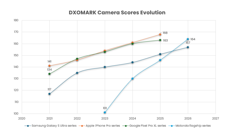*主要旗舰系列 DXOMARK 相机评分演进趋势(2021–2026)
