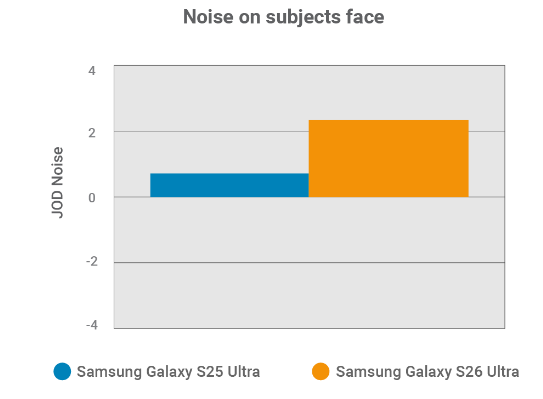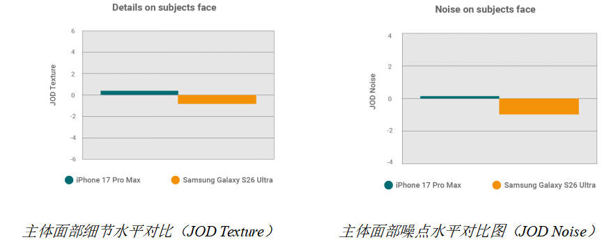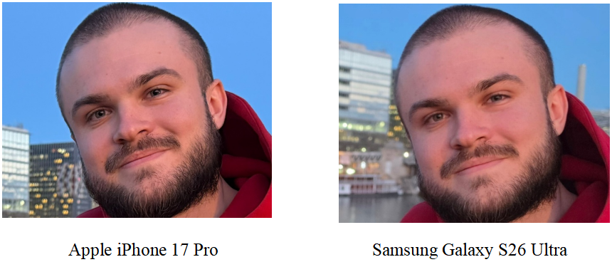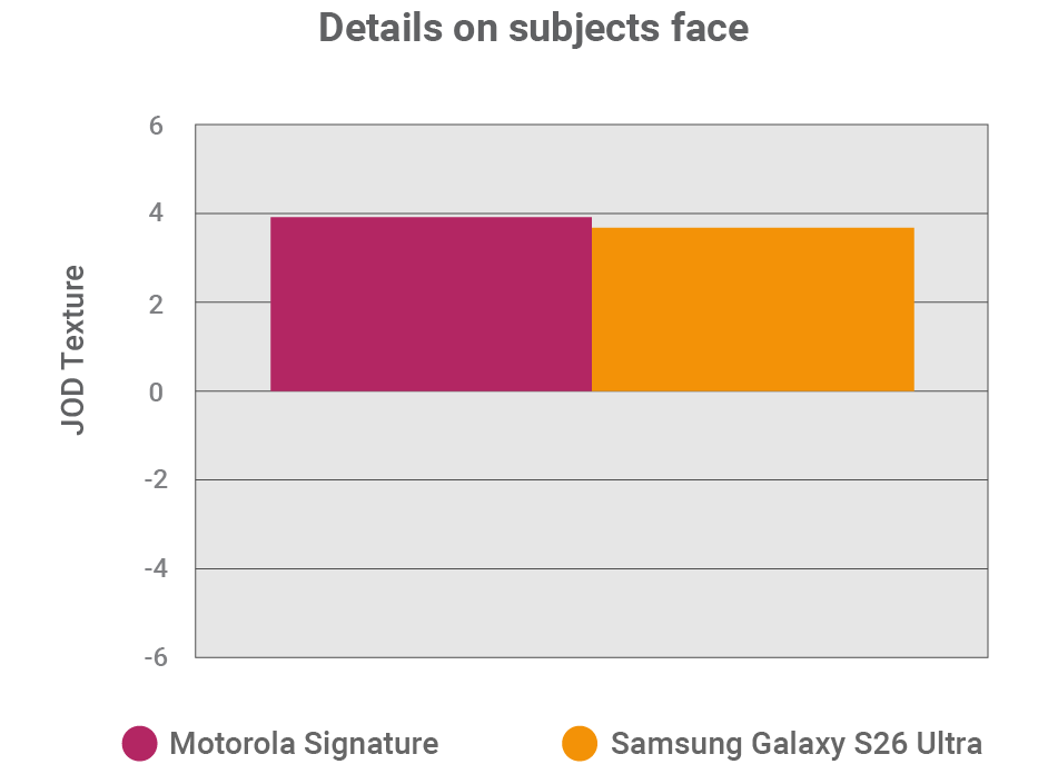 然而,DXOMARK还指出了另一个对 S26 Ultra 人像表现影响显著的因素,这也导致其与竞争对手之间存在质量差距。在拍摄 1× 或使用长焦镜头 时,我们观察到若干 自动对焦问题,尤其是在低光或复杂 HDR 场景中。这些轻微的对焦误差会导致 面部曝光降低以及细节损失,从而影响整体人像表现质量。