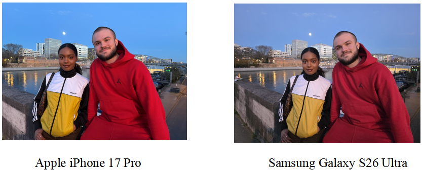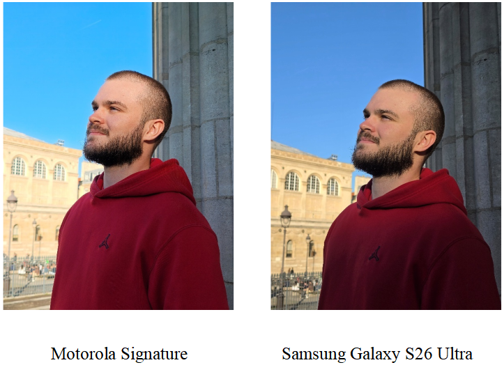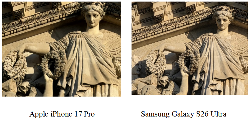 在照片和视频变焦表现方面,三星 Galaxy S26 Ultra 仍是西方市场的强劲竞争者之一。在许多场景中,S26 Ultra 仍能比 iPhone 17 Pro 保留略多细节。然而,竞争对手正在明显缩小与三星双长焦模块之间的差距。iPhone 17 Pro 持续提升其变焦能力,目前在照片和视频方面都已经真正挑战三星系列。其他品牌,例如 Motorola 及其旗舰 Signature 产品,也提供了令人印象深刻的表现,尤其是在摄影方面,可与 Galaxy S26 Ultra 的表现相竞争。
