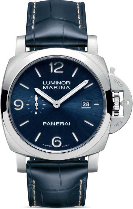 表带:蓝色鳄鱼皮表带,淡褐色缝线。磨砂AISI 316LVM - 1.4441精钢梯形表扣。表带及表扣配备沛纳海快拆系统(PAM Click Release System™)。