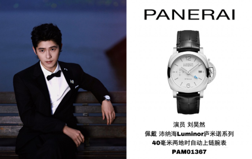 演员刘昊然佩戴沛纳海Luminor庐米诺系列40毫米两地时自动上链腕表PAM1367