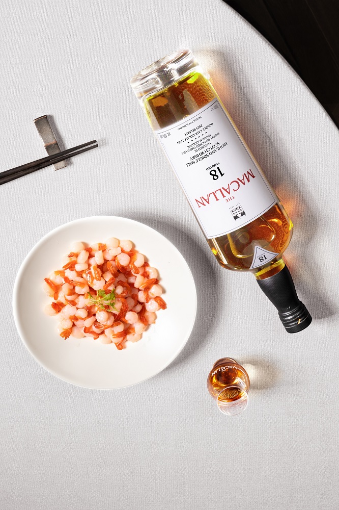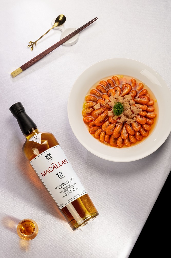 其中,酒麸蒸太湖河虾以清甜提鲜,虾嫩膏丰的本味与麦卡伦双雪莉桶12年的温润橡木香相映,更添清新。