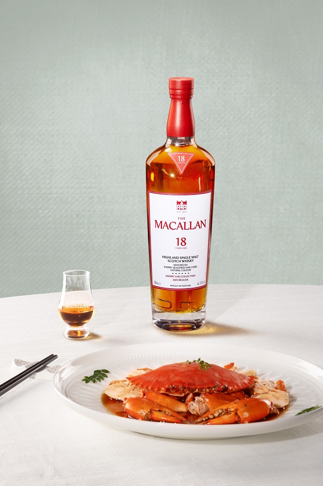 醉熟膏蟹的清甜弹嫩在醉卤中升华,麦卡伦经典雪莉桶12年平衡橡木与香料口感,18年的馥郁果香则中和卤汁咸度,咸鲜后回甘绵长。