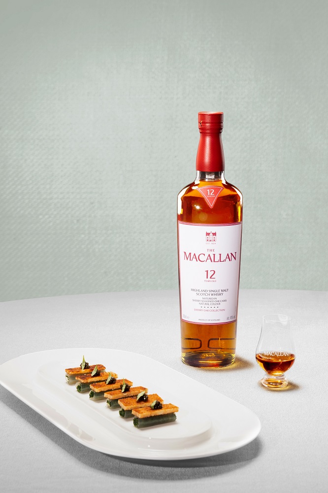 鱼子酱松板肉野菜卷聚多重鲜爽,野菜嫩脆、松板肉鲜香、鱼子酱咸鲜,麦卡伦经典雪莉桶12年的复杂果干香,让多重风味和谐相融。