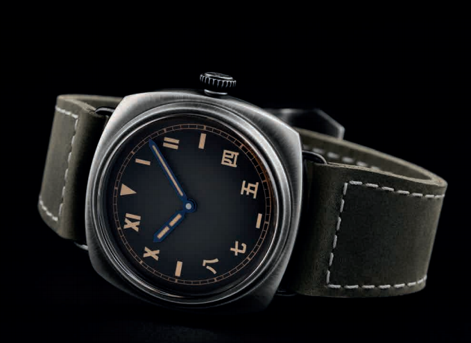 全新Radiomir镭得米尔系列腕表的表盘呈现独特布局,下半部分4、5、7、8时标采用中文数字,上半部分则保留10、11、1、2罗马数字,条形时标与轨道式分钟刻度位于表盘外圈,灰黑色渐变表盘将蓝色抛光精钢指针映衬得格外醒目。指针的独特色调源自高级制表传统的烤蓝处理,这一经典工艺曾是提升抗腐蚀和提高易读性的关键。如今,这种标志性颜色通过约300°C的控温氧化工艺实现。表盘的黑色处理强化复古观感,巧妙呼应早期沛纳海表盘所呈现的氧化效果,拱形蓝宝石玻璃表镜则令人联想到早期为意大利军队研发的Radiomir镭得米尔系列腕表所采用的有机玻璃表镜。米色Super-LumiNova®X1夜光涂层在昏暗环境中散发出绿色夜光,保证清晰读时。