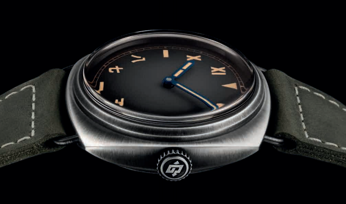 这款限量版腕表采用45毫米枕形表壳,以Brunito 1.4441 LVM精钢材质打造,呈现独特的复古磨旧质感。该工艺经由手工打磨完成,工匠以刷磨方式部分去除黑色PVD涂层,赋予每一枚表壳独一无二的外观。纤细的流线型表耳与圆锥形表冠进一步强化复古魅力,设计灵感来源于沛纳海1935年的历史表款,成为Radiomir镭得米尔系列独具辨识度的设计元素。