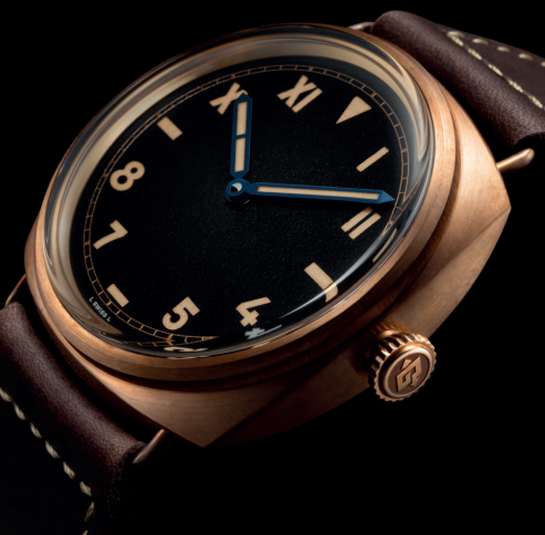 表壳:直径47毫米,磨砂青铜表壳、表圈及表冠。钛金属透明蓝宝石玻璃表背。拱形PLEXIGLAS®有机玻璃表镜。