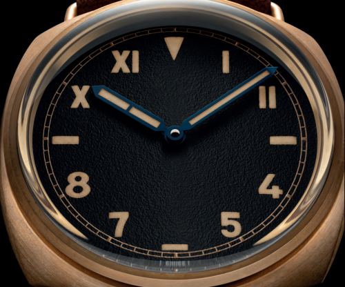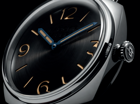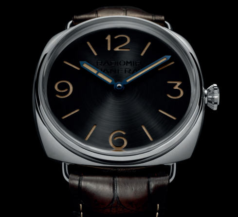 表盘:黑色环形太阳放射纹三明治式表盘。米色Super-LumiNova®夜光涂层涂覆时标、时针和蓝色抛光精钢指针。12点钟位置刻有同色系“Radiomir Panerai”字样。