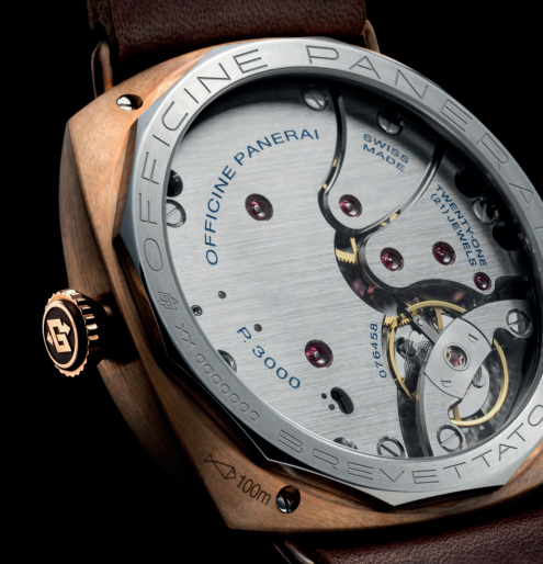 PAM01729腕表搭载P.3000机芯,提供3日动力储存。这款大尺寸机芯的设计灵感源自沛纳海历史表款,其直径为16½法分,结构类似于3/4夹板机芯:一大一小两个夹板,覆盖了大部分机械零件。整体结构以粗螺丝固定,形成一个坚固结构,增强了抗震性。两个发条盒由一系列细长弹簧连接,可长期提供更稳定的动力。