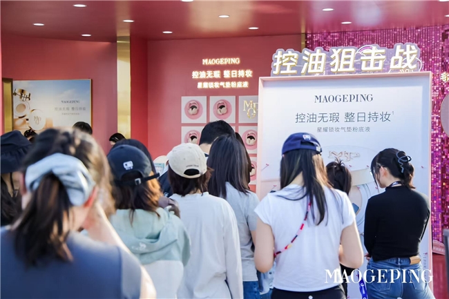 活动现场,除了高颜值打卡空间,毛戈平品牌还在展位设置了轻松趣味的互动小游戏,以沉浸式、年轻化的互动形式让乐迷们“直击”出油、浮粉、斑驳等底妆痛点,构建美妆品牌与年轻群体的新潮对话方式。在一次次的游戏挑战中,将星耀锁妆气垫长效持妆、控油服帖的特点自然传递,深度植入年轻用户心智。