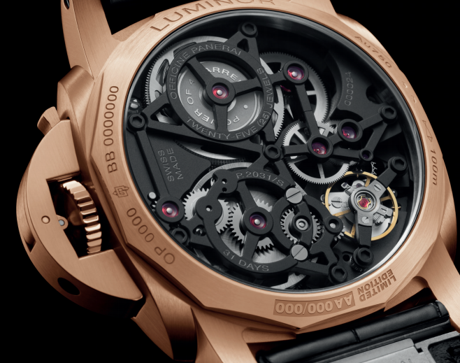 PAM01631腕表搭载全新研发的P.2031/S手动上链机芯,精密的机械构造在镂空结构中一览无余。这款具备31日超长动力储存的开创性机芯,源于沛纳海不断拓宽制表边界的坚定承诺。沛纳海创意工坊(Laboratorio di Idee)对长动力储存机芯进行了大量严苛实验,最终打造出这款前所未有的超长动储机芯,充分显示出研发部门在引领制表技术突破中的核心地位。沛纳海机芯设计的核心理念,是通过策略性串联多个发条盒,最大化发挥动力储存能力。在精心排布下,发条盒以“低扭矩”、快旋转的方式运行,最大限度减少轴心摩擦力与压力,在确保高效率的同时延长使用寿命。这款可提供一个月超长动力储存的机芯共含276个零件和25颗宝石,由四个发条盒构成精密系统,容纳的主弹簧总长度达3.3米。面对这一挑战,研发部门迎难而上,通过巧妙的技术布局,成功打造出可确保持续稳定释放动力的系统。得益于这项创新,佩戴者无需使用任何上链工具,只需将表冠旋转128圈,就可令腕表连续运行31日。与其他长动储机芯相比,沛纳海的解决方案更直接、更可靠,也更便捷。