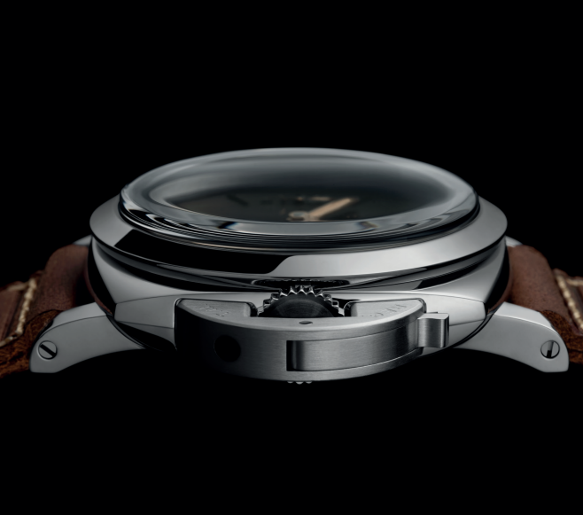 表壳经抛光润饰,搭配磨砂表冠护桥装置,防水性能达30巴(约300米)。在复古表壳构造上实现这一防水级别的突破,体现了沛纳海对提升防水性能的不懈追求,亦彰显品牌作为意大利海军潜水仪器供应商的深厚传承。