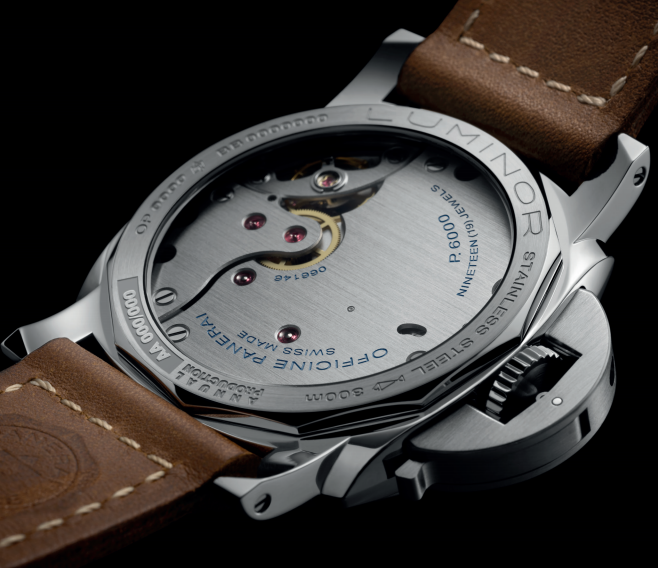 两款新作的核心配置,尽显复古格调。44毫米精钢表壳搭配拱形蓝宝石玻璃表镜,重现了20世纪60年代Luminor庐米诺腕表所采用的PERSPEX®有机玻璃的视觉效果。这一细节设计不仅提升了表盘的视觉深度与读时清晰度,更是对品牌早期专业仪器的致敬。透过蓝宝石玻璃表背,沛纳海自制P.6000手动上链机芯的精密构造一览无余。该机芯具备三日动力储存,直径15½法分,平衡摆轮每小时振动21,600次,由横跨式摆轮夹板固定,显著提升调速装置的稳定性。为实现精准校时,机芯具备停秒功能。当表冠拉出至第二挡位时,即可启动这一实用装置:内部簧片掣停摆轮,表盘上的小秒针随即暂停运转,此时即可精准调校时间。