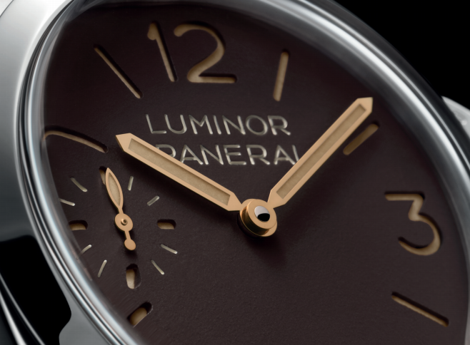 PAM01731腕表采用烟草色表盘,为品牌系列作品重新注入深棕色调。表盘采用三明治式结构,由两层圆盘相叠而成,在各种光线条件下均能提供清晰且持久的可读性。9点钟位置设有小秒盘,这一表盘结构生动诠释了该表款植根传统的设计风格。腕表配备一条直线型复古深棕色小牛皮表带,另附一条同色系橡胶表带,是潜水探险的理想伙伴。