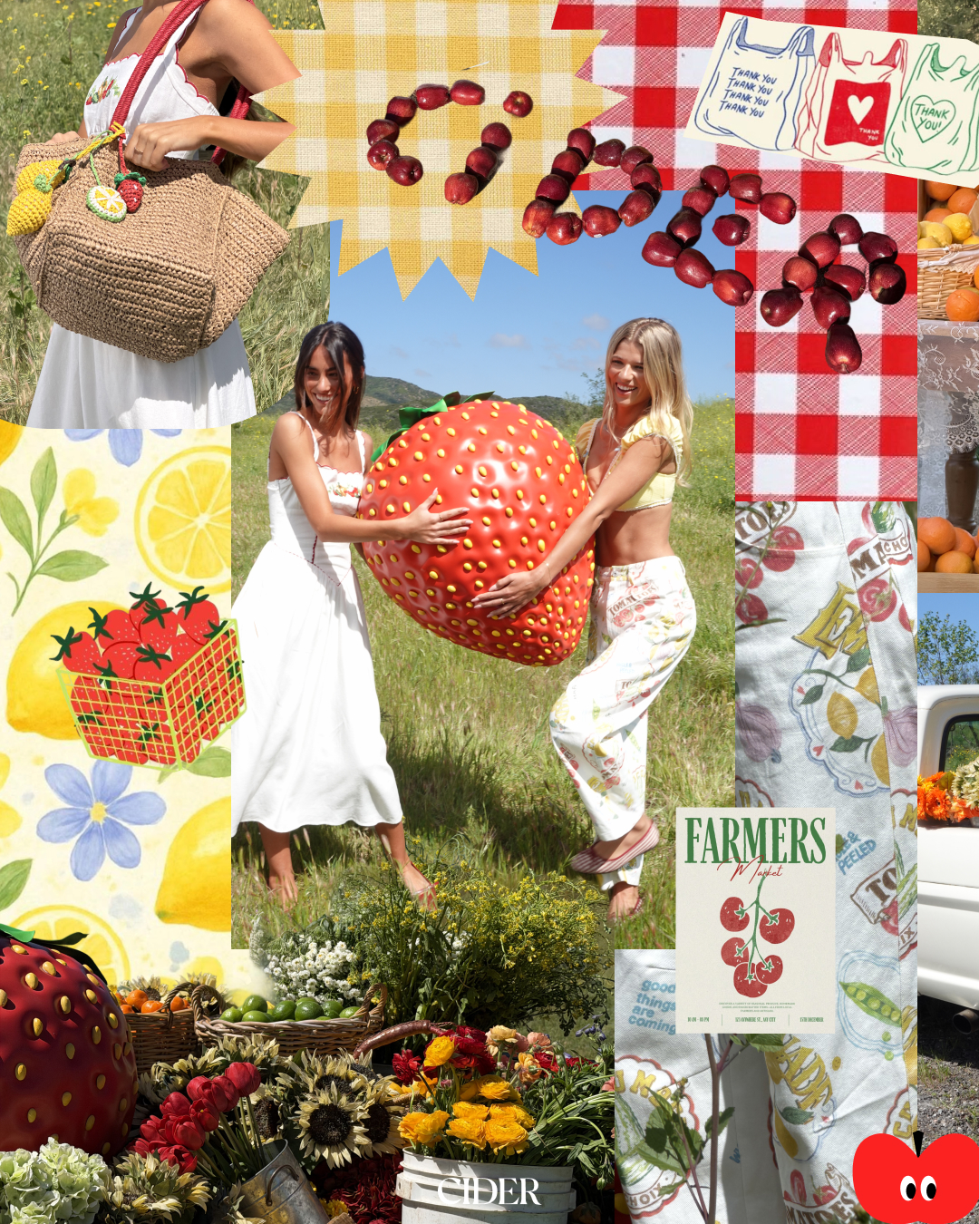 与首店同步亮相的“Original Farmers Market限定系列”,则进一步将品牌美学与门店所在地的文化做了绑定。该系列以市集文化为灵感,融入趣味食物图案、棋盘格元素,通过钩针编织、刺绣等手工细节呈现,涵盖服装、泳装及配饰单品。它不是简单的“洛杉矶限定”标签,而是将Farmers Market近百年的生活气息,翻译成了CIDER独有的玩味设计语言。