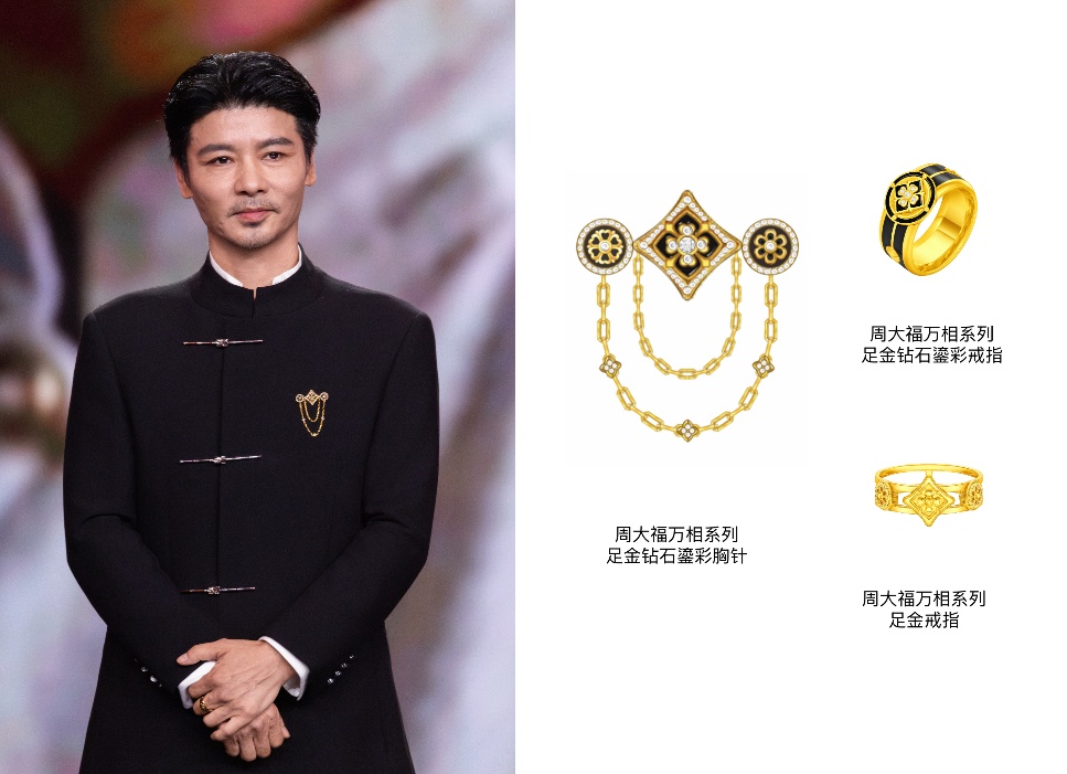 演员张晋佩戴万相系列足金钻石鎏彩胸针及同系列足金戒指,使文化意蕴与先锋潮流巧妙碰撞。胸针以玄黑鎏彩为底,四瓣花图腾簇拥中心红宝石,刚柔并济间展现时髦的现代气质,彰显优雅绅士风度。